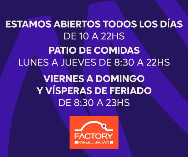 Empezá tu recorrido aquí Locales Actividades Gastronomía Horarios Servicios Más información Ver más actividades Promociones Ver más promociones Cómo llegar Cómo llegar a Parque Brown Abierto · Cierra a las 20:00 hrs. Accesos: Acceso Fernandez de la Cruz Acceso Av. Escalada Cómo llegar